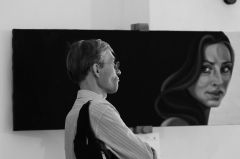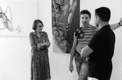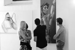I suoi dipinti, di grandi misure, ruotano attorno ai temi di presenza-assenza, velocità-lentezza, l'ibrido, il doppio, l'intenso, il sensuale, come lui stesso racconta mentre mi conduce in visita guidata alla sua personale.